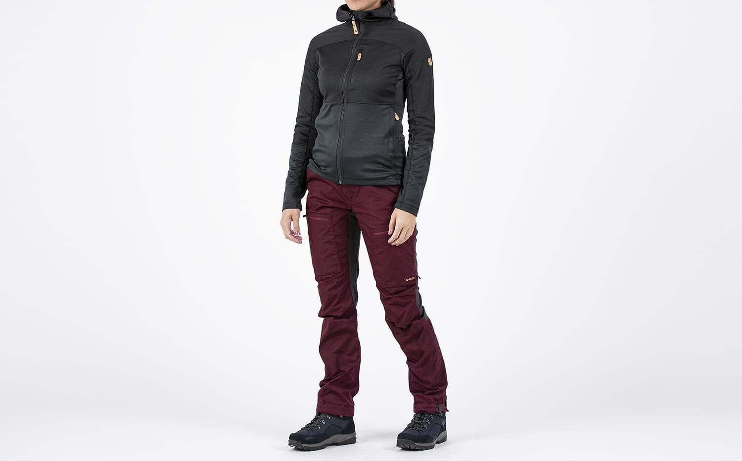 - Delikatnie podwyższony pas z tyłu spodni dla większego komfortu podczas marszu z plecakiem.